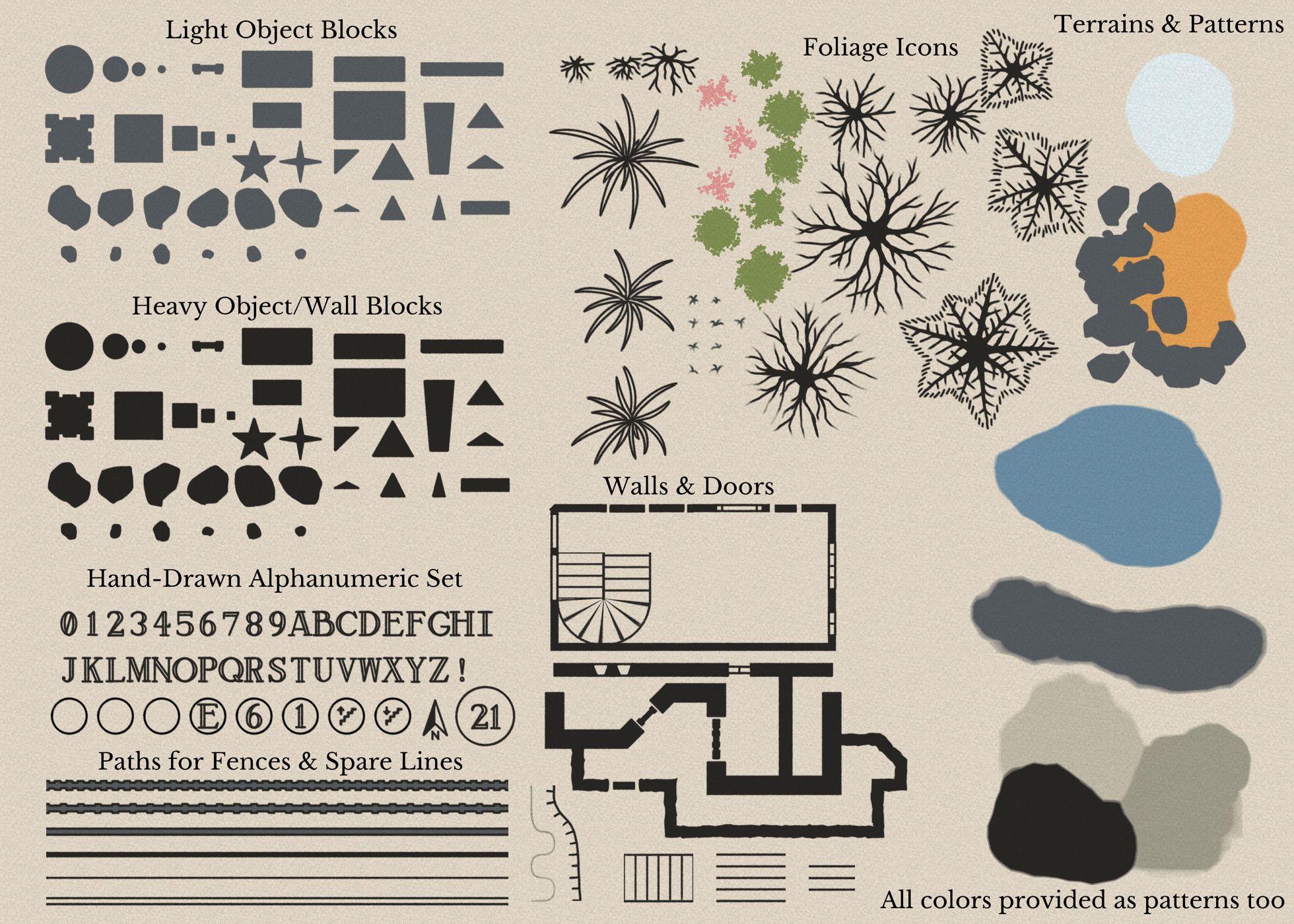 This is a genre-agnostic floor plan kit for Dungeondraft. Created at first for my own purposes, as I felt Dungeondraft’s assets were too specific for fast map design; I wanted something more lenient where imagination was concerned. This pack is my solution.