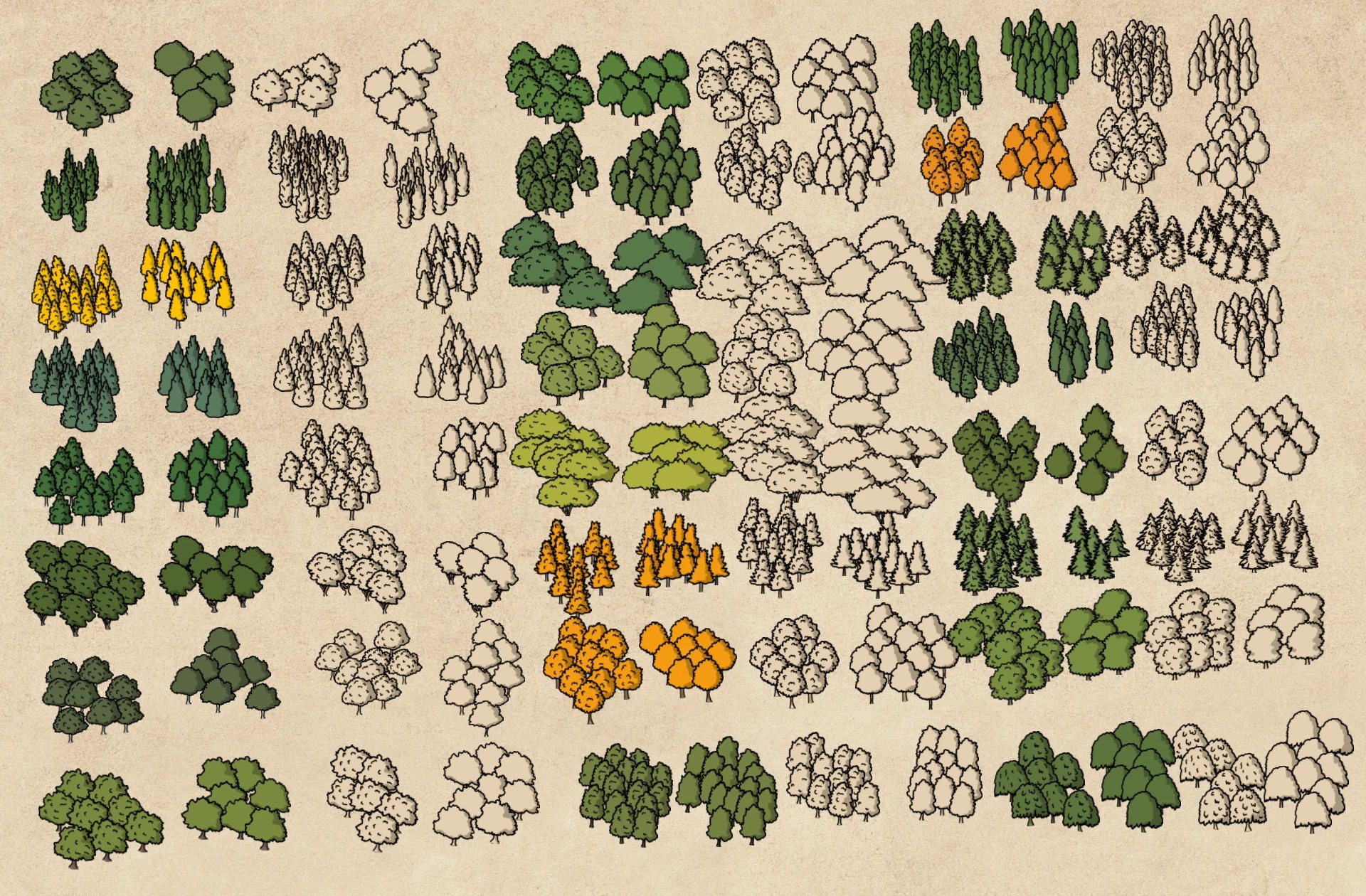 This pack offers a variety of hand-drawn trees that can be used to bring your maps to life. With 24 different types of trees in four variations, you’ll have the flexibility to indicate large forests or individual trees in a city.