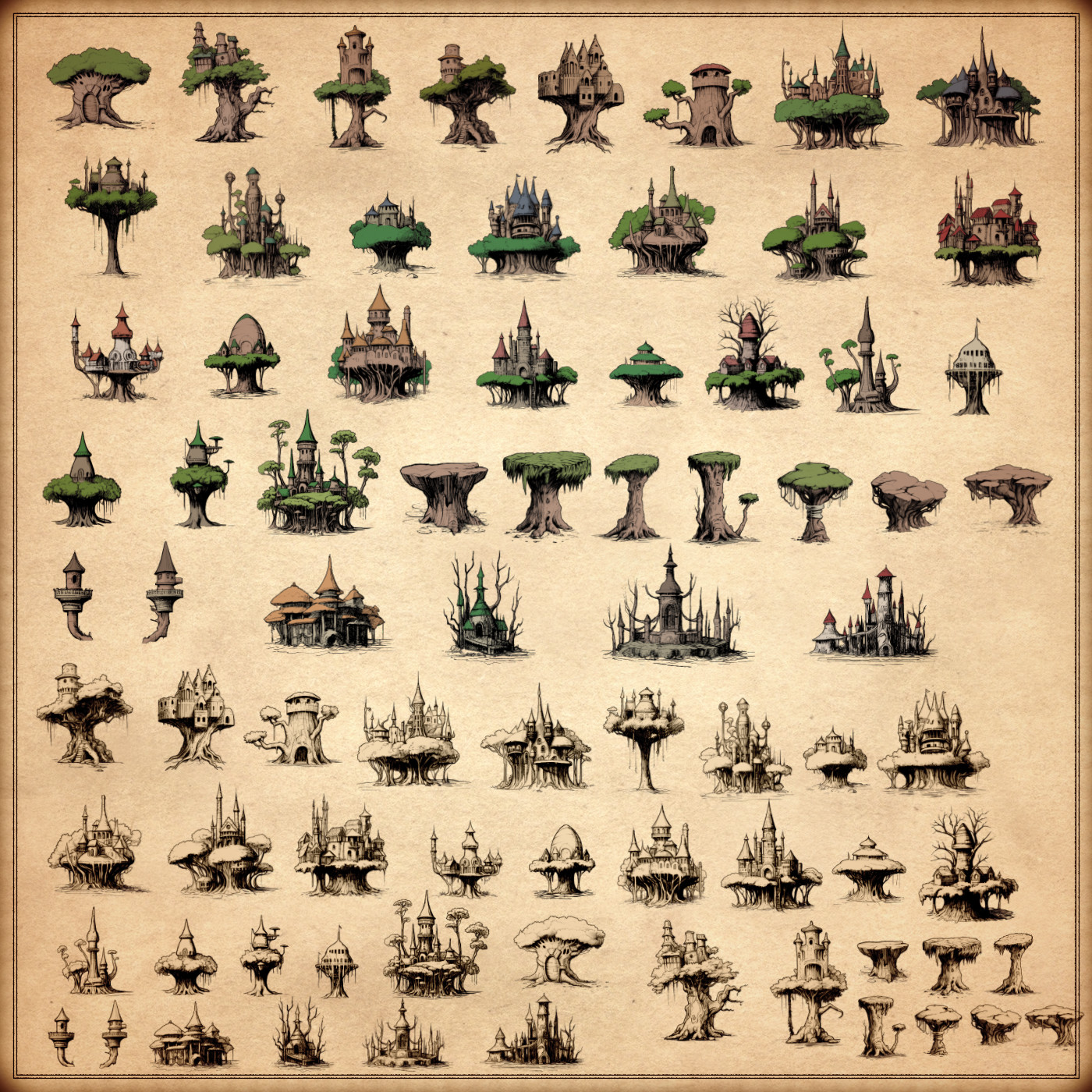 117 vintage assets : Elven treehouse towns, fantasy medieval treehouses, habitable trees, human treehouse towns, settlements, and hamlets, treehouse temples, treehouse forts, treehouse castles. Also: trunks, cities, and trees in a stump/treehouse settlements creation kits, and more ! for three types of variations (normal, colorable, paintable ).